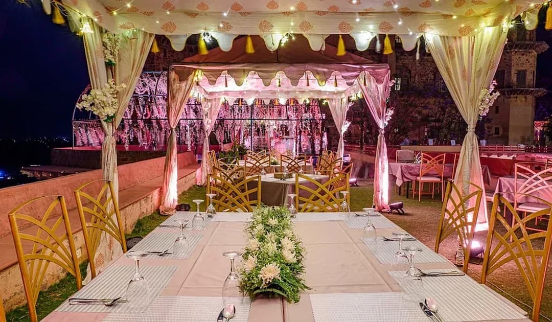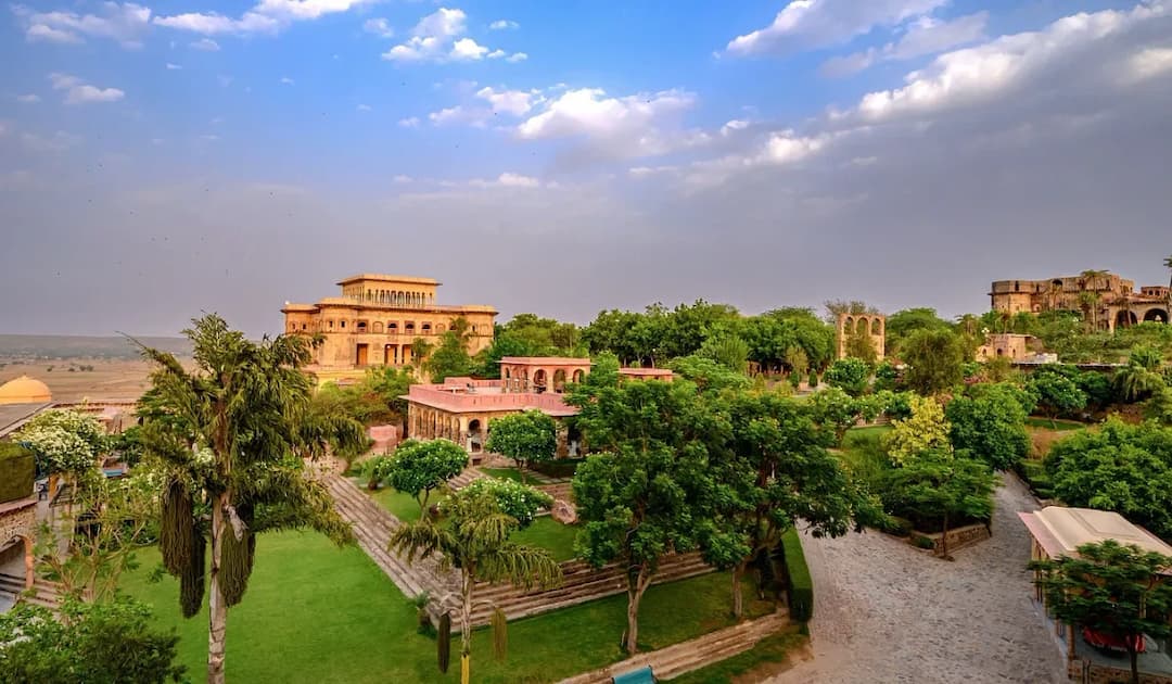Spread across acres of landscaped gardens and ancient ramparts, Tijara Fort Palace showcases a rare combination of Rajput and Afghan architectural styles. The property is divided into several beautifully restored sections — Rani Mahal, Mardana Mahal, Hawa Mahal, and Deewar Mahal — each telling its own story of regal charm. The palace’s seven terraced gardens and sweeping countryside views create an atmosphere of calm grandeur.